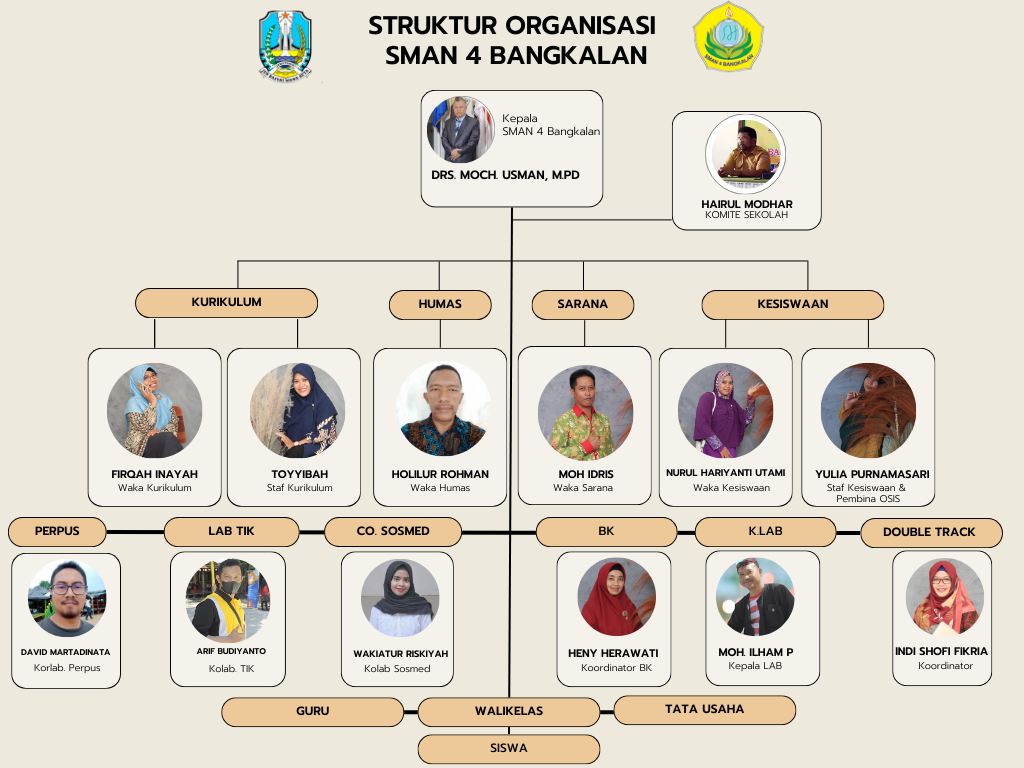 Assalamualaikum wr.wb Puji Syukur kehadirat Allah SWT karena berkat rahmat dan karunia-Nya maka kami dapat melakukan proses pemutakhiran website SMAN 4 Bangkalan ini. Website ini merupakan salah satu sarana yang dapat diakses oleh warga sekolah maupun masyarakat umum yang ingin mengenal lebih dekat lagi profil, kegiatan serta fasilitas yang ada di sekolah kami. SMA Negeri 4 Bangkalan selalu berupaya untuk terus mengembangkan diri melalui jaringan teknologi informasi sebagai wahana interaksi yang dapat dijangkau berbagai pihak. Kami sadar website ini masih dalam taraf penyempurnaan sehingga saran dan dukungan sangat kami butuhkan untuk kemajuan website sekolah kami. Wassalamualaikum Wr.Wb